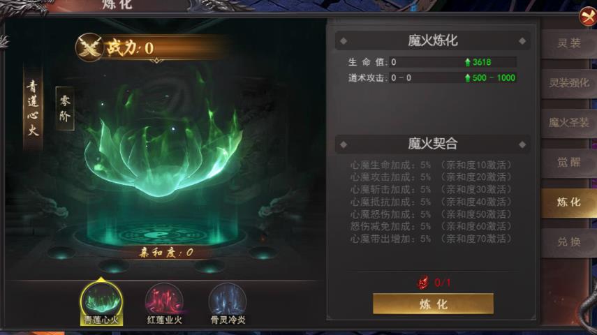 ①.使用道具进行炼化魔火,每次炼化进阶其契合度,契合度达到特定等阶可以激活额外属性。