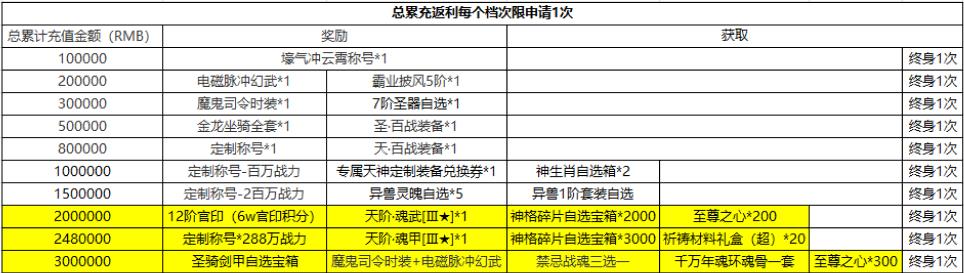 1、累充返利申领时间有效期:从未申请过对应累充档位的角色。