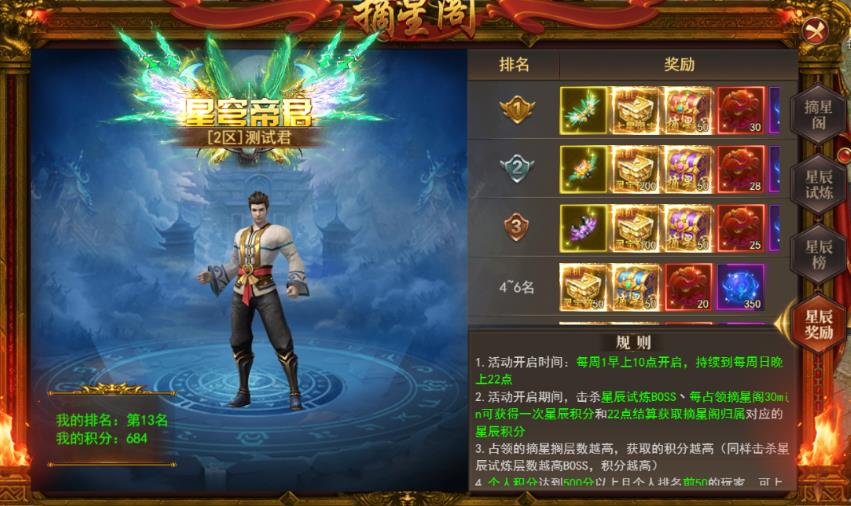 2.活动开启期间,击杀星辰BOSS,每占领摘星阁30分钟可获得一次星辰积分和22点结算获取摘星阁归属对应的星辰积分。